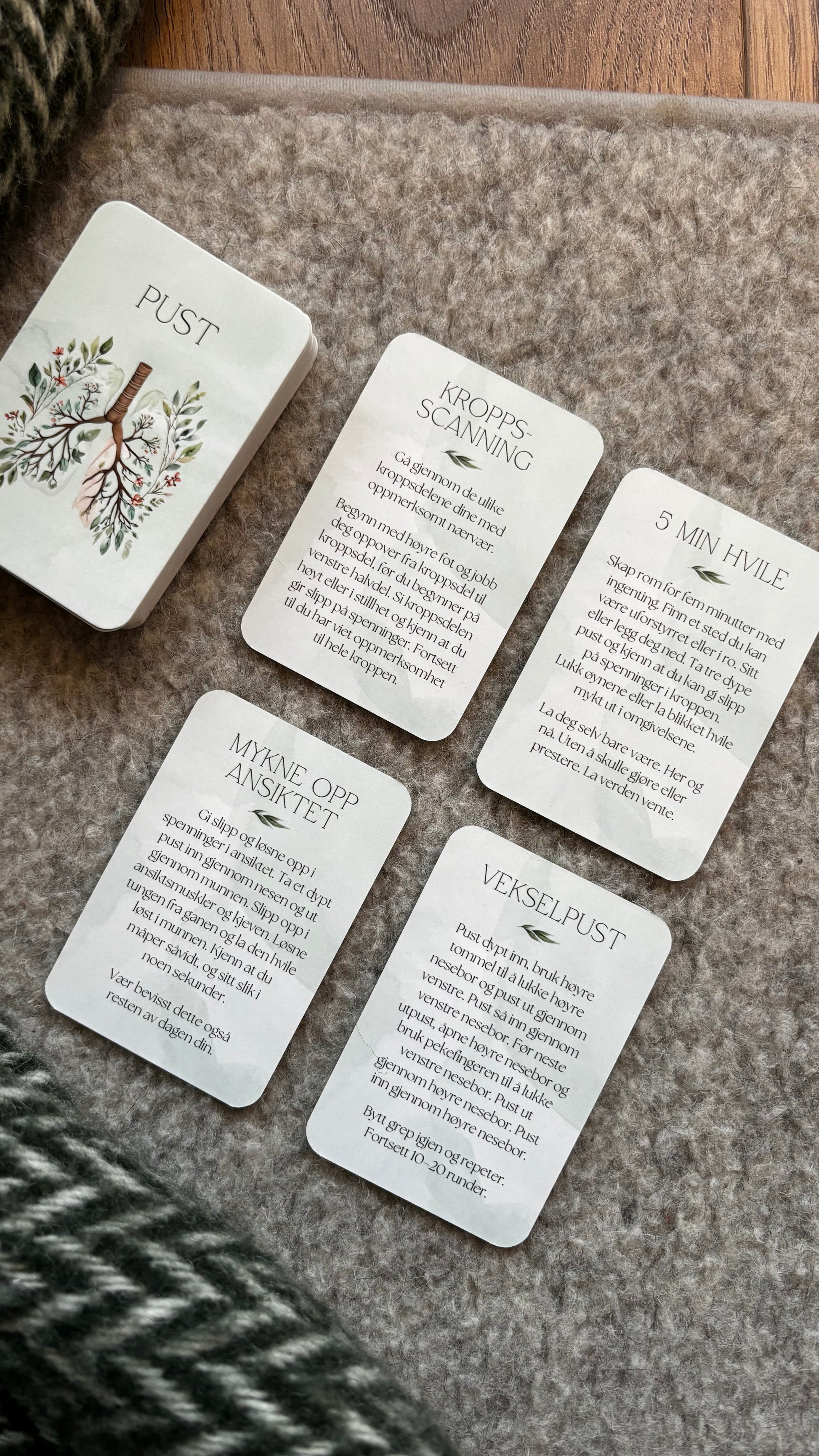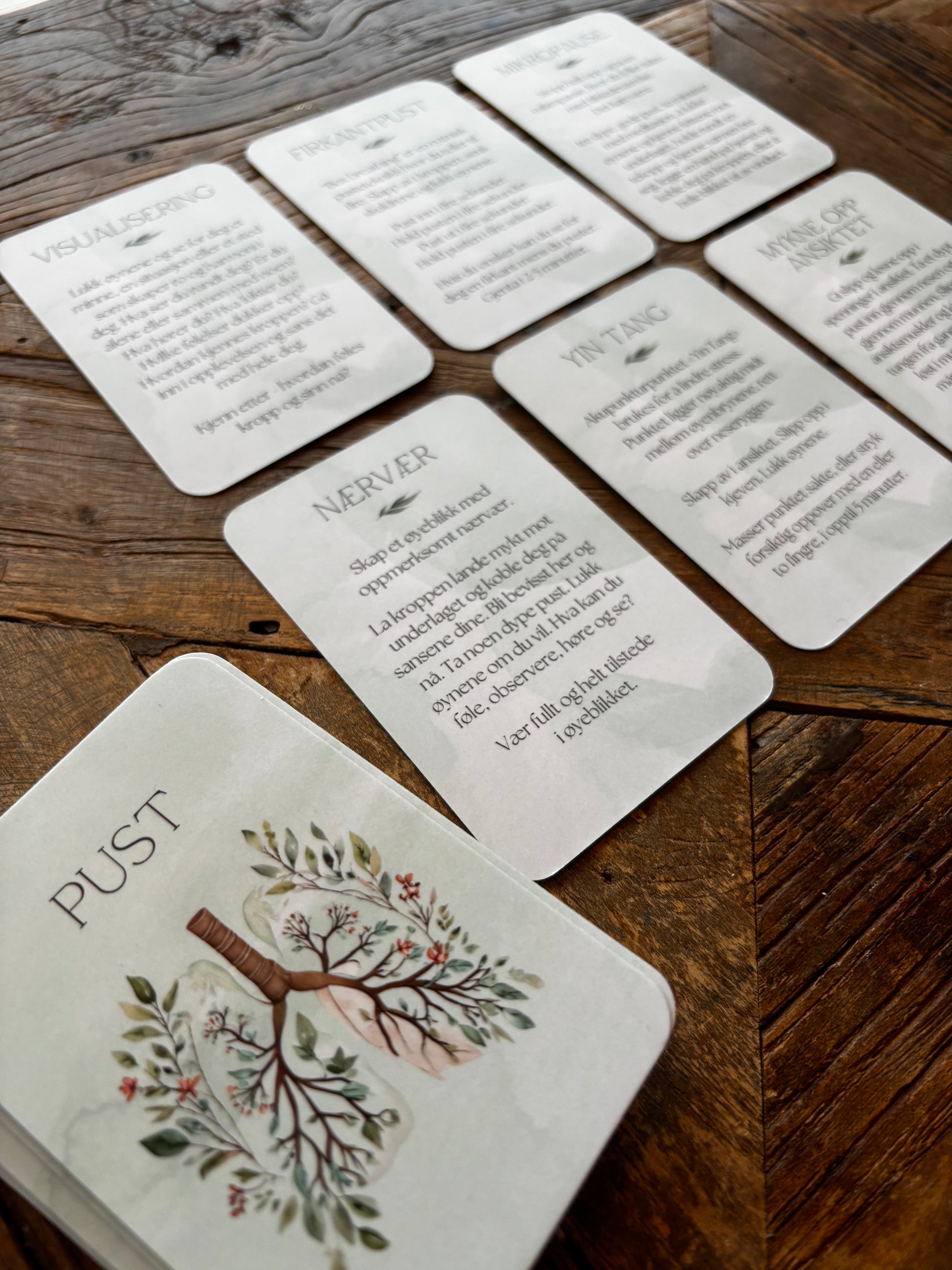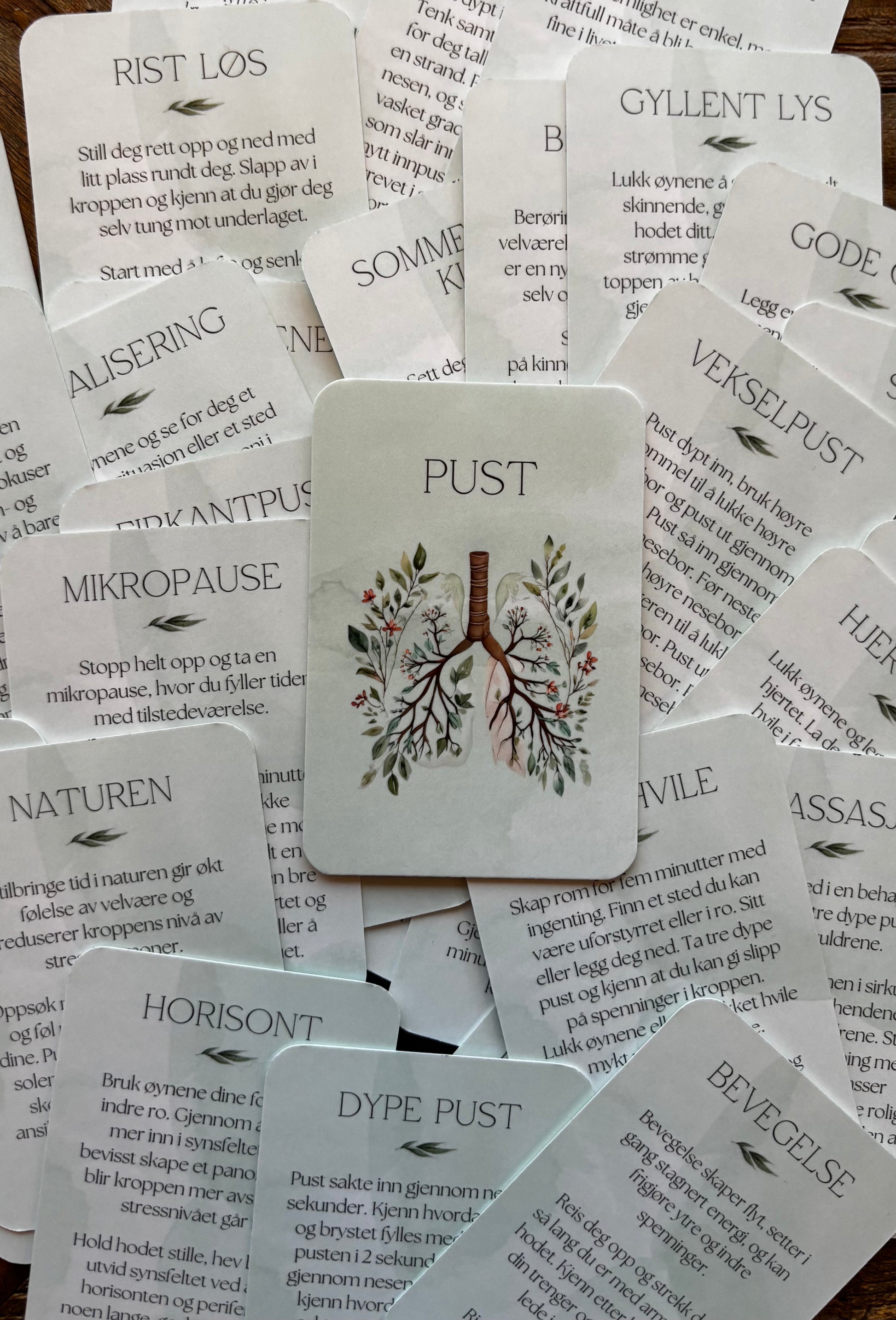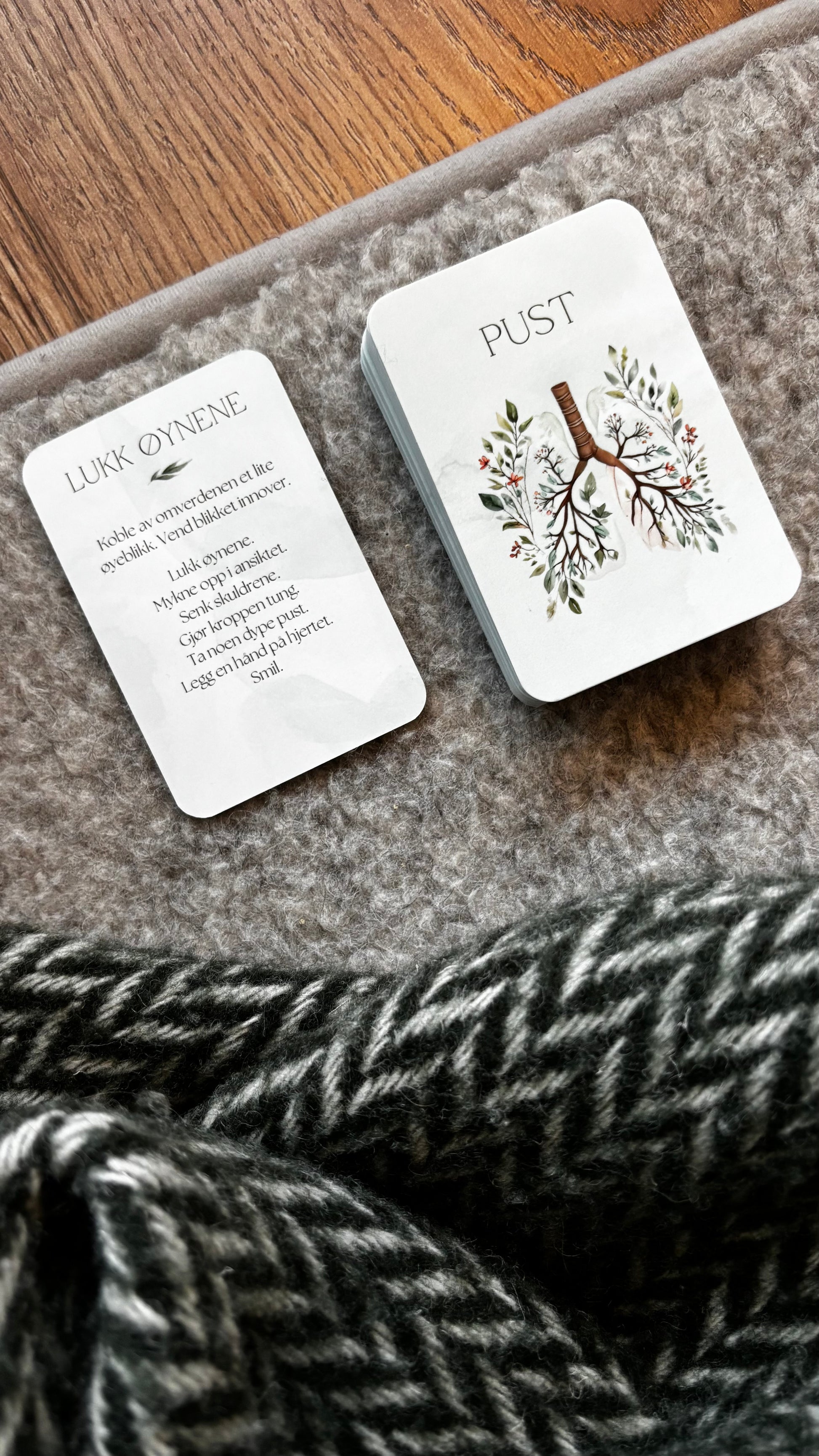 Stokk bunken og trekk et kort når du har lyst på eller behov for en pause. Hvert kort består av en enkel øvelse du kan gjøre her og nå, som hjelper deg å finne ro og styrke din egen hvilekraft.